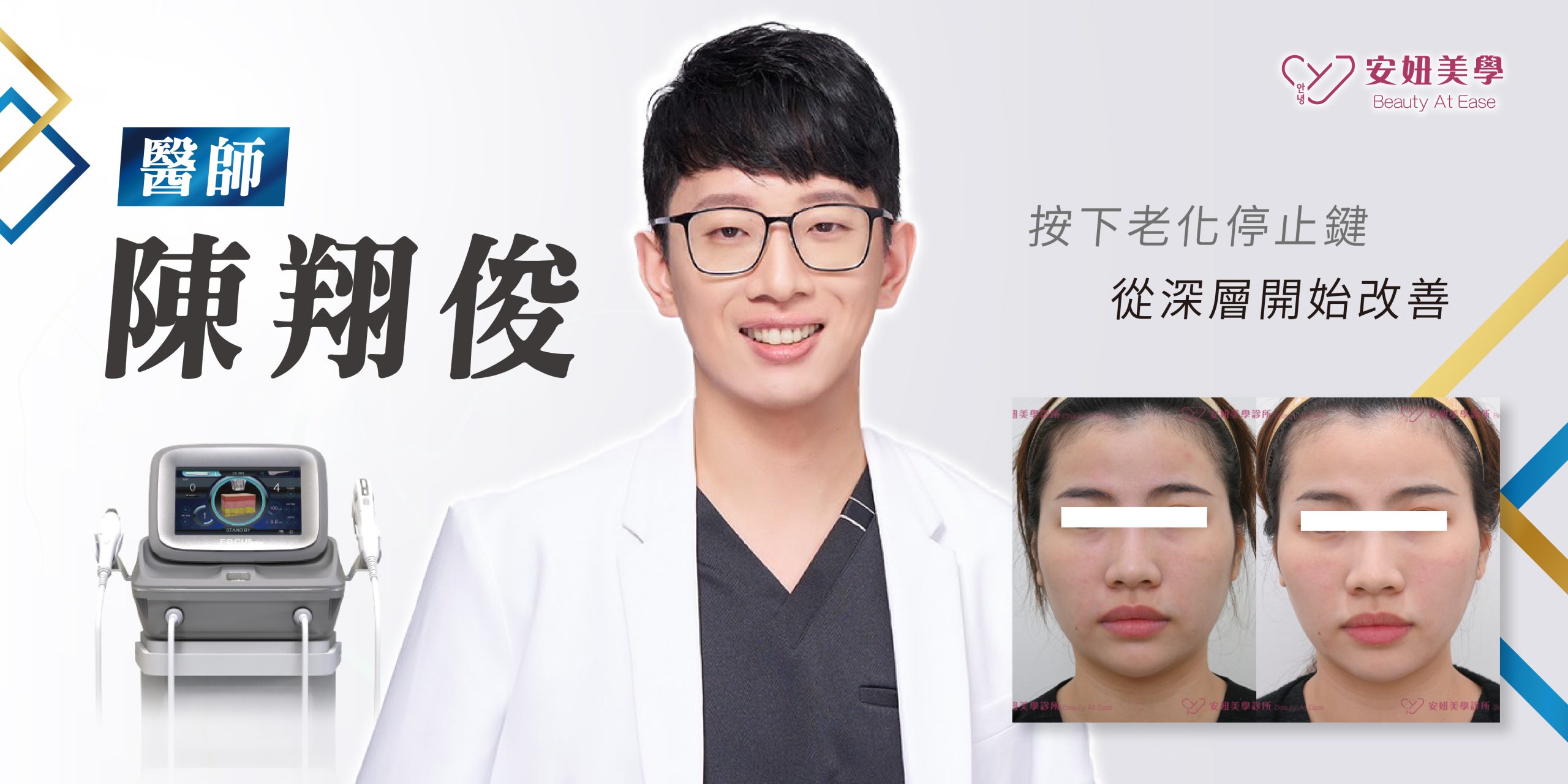 一開始我想說安妞是連鎖的,醫師的品質應該都不差,就沒有指定醫師。但還好後來選的陳翔俊醫師人滿好的,雖然是男醫師,但非常細心地解釋了閃電音波的原理以及效果,並且根據我的臉型給了一些建議,美感也不錯,也有一些案例給我參考。加上陳醫師說閃電音波能夠刺激膠原蛋白增生!所以我當下就立刻決定做閃電音波,因為我真的很希望能夠讓自己的臉看起來更年輕一些….