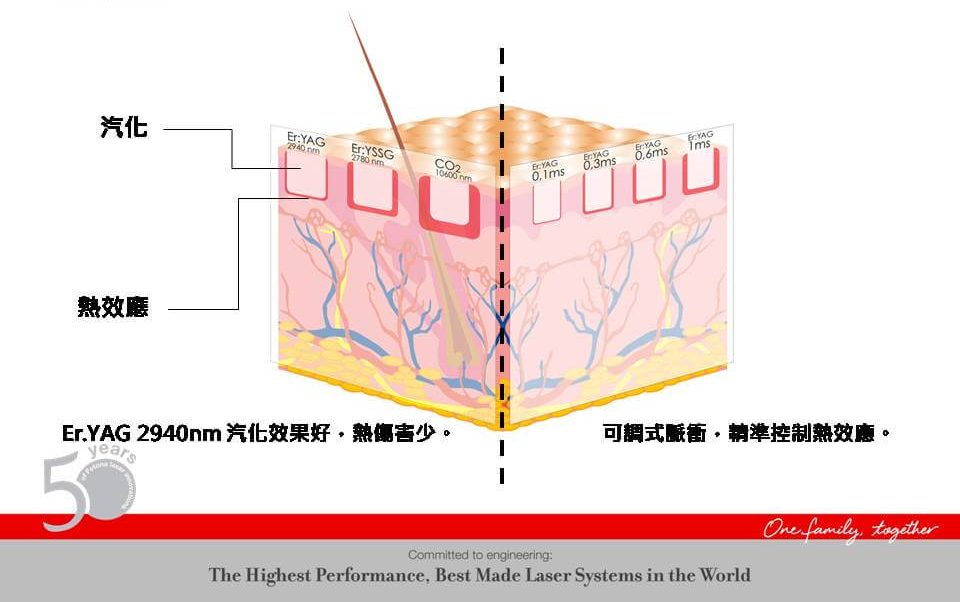 Fotona 鉺雅鉻汽化雷射( Er:bium YAG Lase) 是波長2940nm的雷射光束,因其水分高度吸收的關係,當雷射通過表皮,能造成皮膚組織汽化剝離,對於疤痕、老化等組織形成微創傷口,刺激組織進行自我修復及膠原增生的連續反應,達到煥膚的功效。