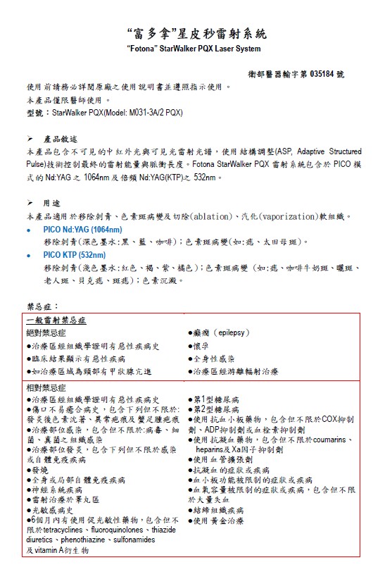 (“富多拿”星皮秒雷射系統 “Fotona” StarWalker PQX Laser System)